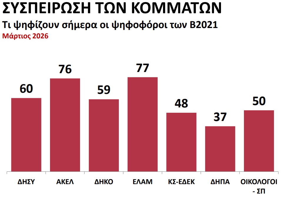 Τη μεγαλύτερη συσπείρωση παρουσιάζει το ΕΛΑΜ με 77%. Υψηλή συσπείρωση που αγγίζει το 76% πετυχαίνει το ΑΚΕΛ, ενώ ο ΔΗΣΥ φτάνει στο 60%. Η συσπείρωση του ΔΗΚΟ διαμορφώνεται στο 59%, του Κινήματος Οικολόγων στο 50% και της ΕΔΕΚ στο 48%. Η ΔΗΠΑ μέχρι που αγγίζει το 37%.