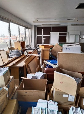Φακέλοι, έγγραφα, καρέκλες όλα ρημαγμένα στον αποθηκευτικό χώρο του νοσοκομείου, που προηγουμένως λειτουργούσε ως πισίνα φυσιοθεραπευτηρίου.