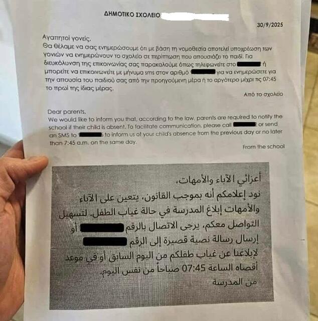 Τις τελευταίες ημέρες κυκλοφορεί στα social media ενημέρωση γονέων συγκεκριμένου δημοτικού σχολείου, γραμμένη στα ελληνικά, αγγλικά και αραβικά. Η αντίδραση κάποιων ήταν ότι «κινδυνεύει ο Ελληνισμός» και «γίναμε μειονότητα στα σχολεία μας». Και όμως. Το Δημόσιο Σχολείο της Κυπριακής Δημοκρατίας υποχρεούται, σύμφωνα με το Άρθρο 28 του Συντάγματος και τη Σύμβαση των ΗΕ για τα Δικαιώματα του Παιδιού (Ν. 243/1990), να εξασφαλίζει ισότιμη πρόσβαση και κατανόηση της πληροφόρησης για όλους τους γονείς, ανεξαρτήτως εθνικής ή γλωσσικής προέλευσης. Επομένως, η μετάφραση του ενημερωτικού σημειώματος σε άλλες γλώσσες, αποτελεί νόμιμη υποχρέωση του κράτους. Άρα, κανένας Ελληνισμός απειλείται από ένα μήνυμα προς τους γονείς για να τους ενημερώσει - ως οφείλει - αν απουσιάζουν τα παιδιά τους απο το σχολείο.