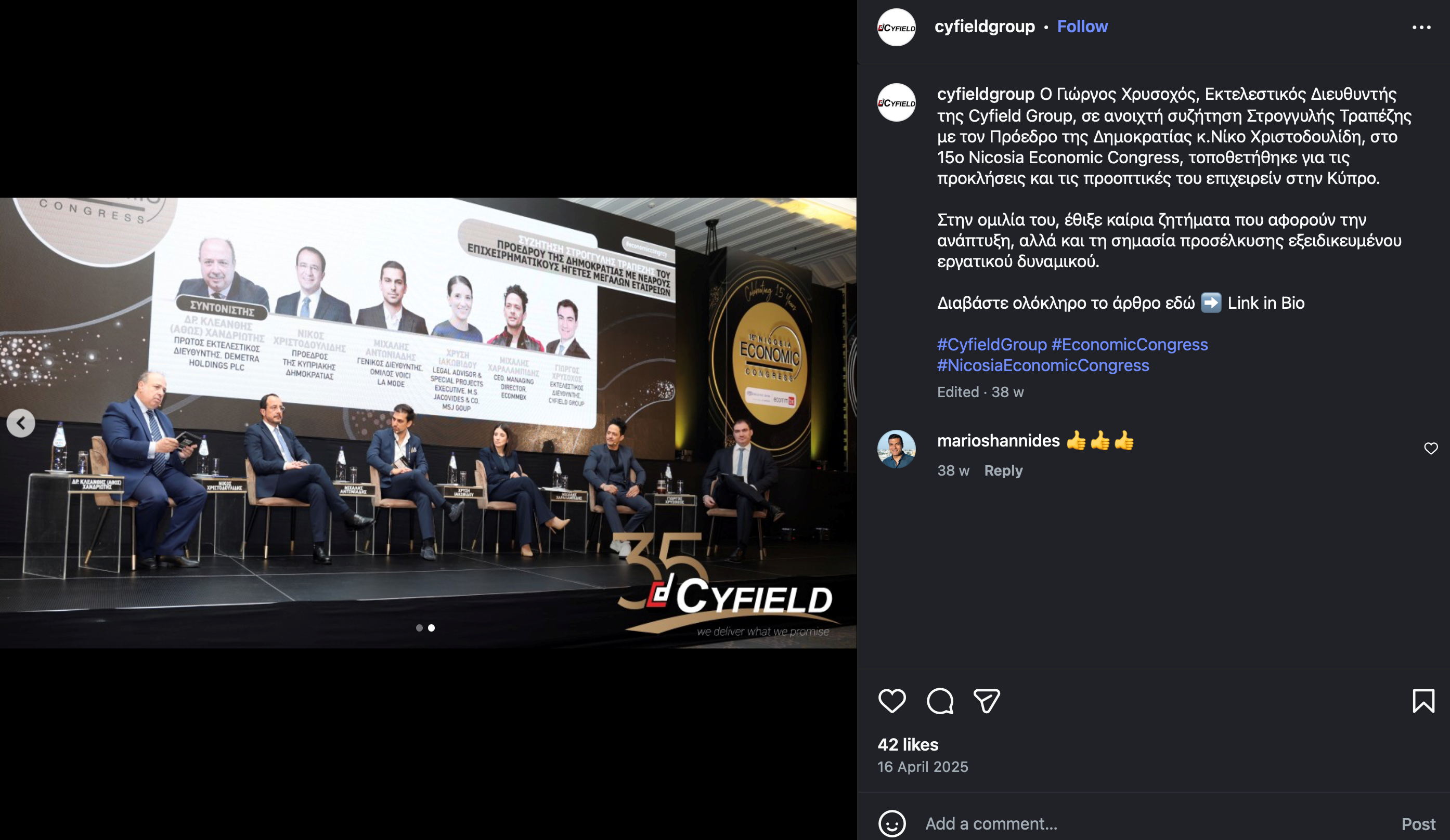 Στις 15 Απριλίου του 2025, ο Πρόεδρος Χριστοδουλίδης ήταν σε συζήτηση στρογγυλής τραπέζης με τον Γιώργο Χρυσιοχό στο πλαίσιο του Nicosia Economic Congress