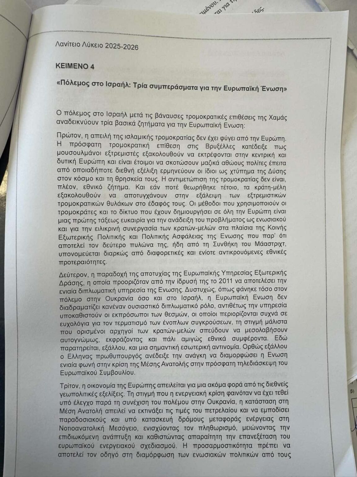 Το κείμενο που απεικονίζεται στη φωτογραφία δόθηκε σε μαθητές και μαθήτριες του Λανιτείου Λυκείου, στο πλαίσιο της προετοιμασίας τους για τον ετήσιο διαγωνισμό της ελληνικής πρεσβείας. Πρόκειται για ένα κείμενο που δεν εκπαιδεύει αλλά δηλητηριάζει, αναπαράγοντας ωμές γενικεύσεις και ρητορική φόβου, με αναφορές σε «ισλαμιστική τρομοκρατία που εξαπλώνεται στην Ευρώπη» και «τρομοκρατικά δίκτυα σε ολόκληρη την Ευρωπαϊκή Ένωση». Τέτοιες διατυπώσεις δεν είναι αθώες· καλλιεργούν ισλαμοφοβία, νομιμοποιούν τον συλλογικό στιγματισμό και μετατρέπουν το σχολείο σε χώρο αναπαραγωγής μίσους.