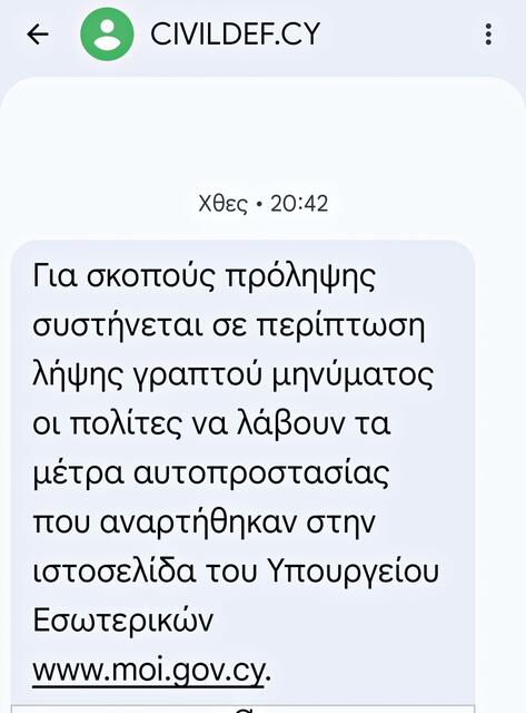Μας ενημέρωσαν (όπως πάντα με στόμφο για το μέγα κατόρθωμα) ότι την Τετάρτη το βράδυ στις 7.00 θα λαμβάναμε, όλοι οι πολίτες στα τηλέφωνά μας, δοκιμαστικό προειδοποιητικό μήνυμα για την ανάγκη λήψης μέτρων προστασίας, λόγω της έκρυθμης κατάστασης στην περιοχή. Το τι έγινε τελικά όλοι το γνωρίζουν. Άλλοι πολίτες έλαβαν το μήνυμα, άλλοι με μικρή ή μεγάλη καθυστέρηση, άλλοι μόνο στα Ελληνικά, άλλοι μόνο στα Αγγλικά, άλλοι και στις δύο γλώσσες και πολλοί άλλοι δεν το έλαβαν ποτέ. Προσωπικά έλαβα το μήνυμα στις 20:42, μία ολόκληρη ώρα δηλαδή και 42 λεπτά μετά, που αν υποθετικά υπήρχε κίνδυνος θα έπρεπε να μετακινηθώ σε ασφαλές μέρος κ.λπ. κ.λπ. Με λίγα λόγια δηλαδή, αν όντως υπήρχε κίνδυνος, θα ήμουν τώρα… μακαρίτης. Όσο για εκείνους που δεν έλαβαν ποτέ το μήνυμα, τι να πούμε; Ότι προφανώς τους υπολόγισαν στις λεγόμενες… παράλληλες απώλειες;